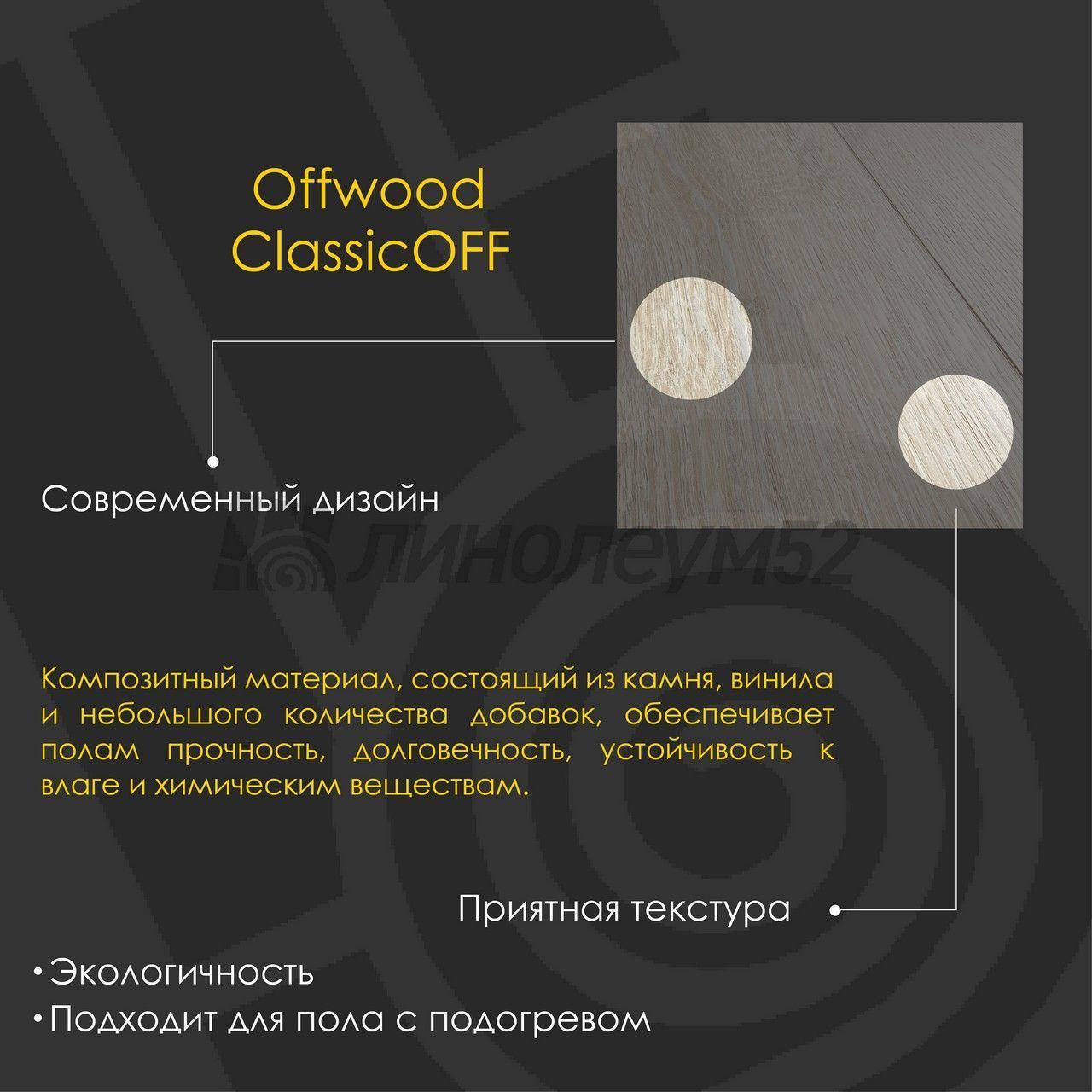 | Уникальные свойства: | Подходит для пола с подогревом +27°С / Продажа товара отпускается в упаковках / Уникальный стиль / Экологичность |