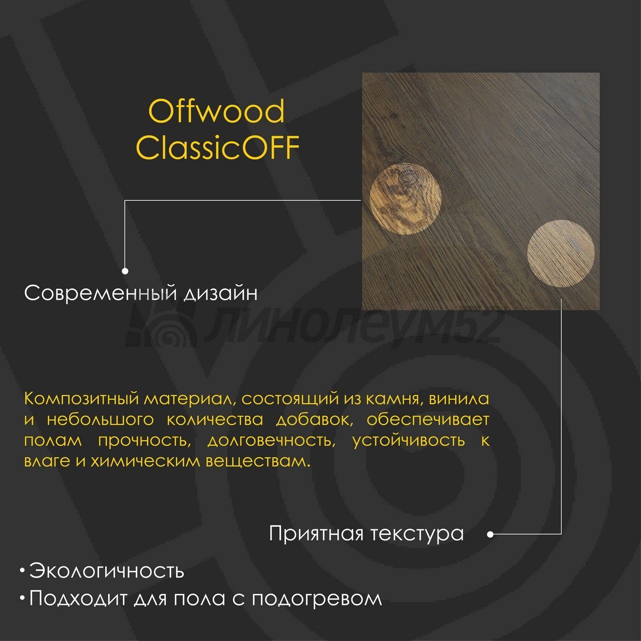 Уникальные свойства: Подходит для пола с подогревом +27°С / Продажа товара отпускается в упаковках / Уникальный стиль / Экологичность