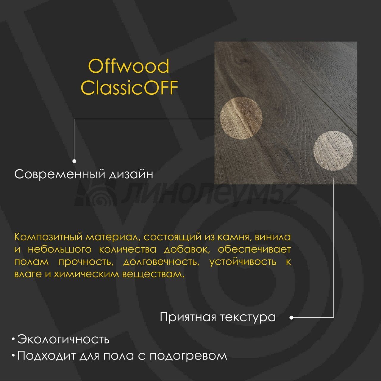 Уникальные свойства: Подходит для пола с подогревом +27°С / Продажа товара отпускается в упаковках / Уникальный стиль / Экологичность