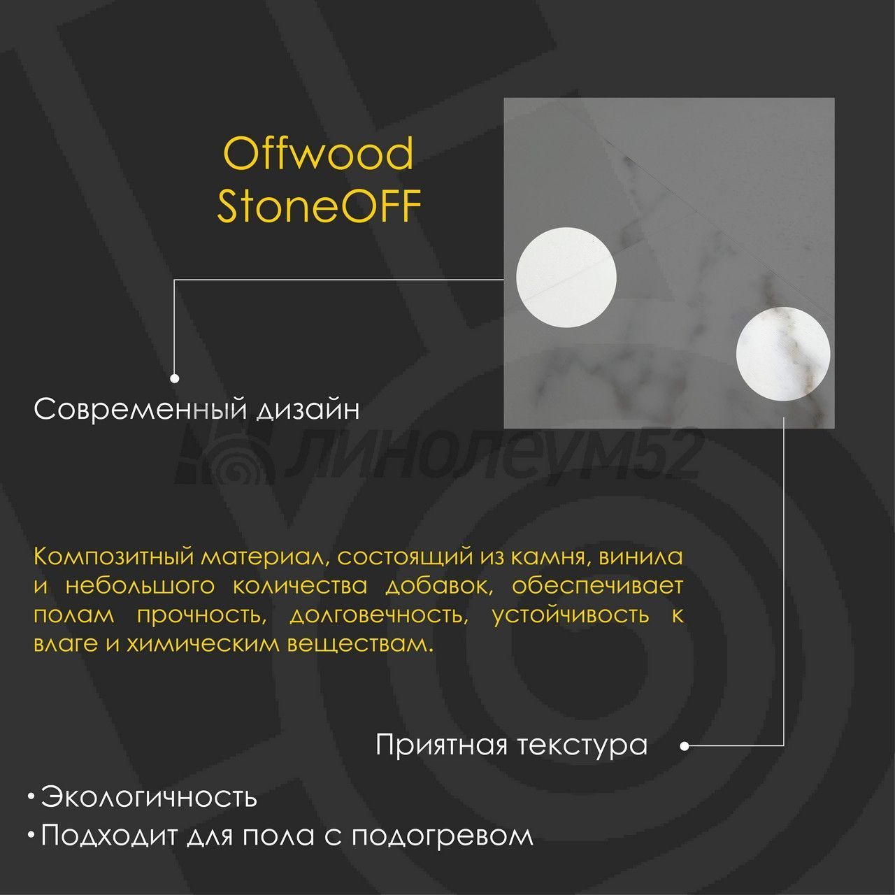 OFFWOOD StoneOFF — коллекция напольных SPC покрытий. Полимерные полы характеризуются прочностью, долговечностью, устойчивостью к воздействию влаги и химических веществ. Напольные покрытия предназначены для укладки как в коммерческих помещениях с высокой проходимостью, так и в жилых пространствах. Полы имеют класс пожарной опасности КМ2, что подтверждает их безопасность и экологичность. Структура полов имитирует натуральный камень. Благодаря цифровой печати, дизайн верхнего слоя выглядит реалистично и эстетично, добавляя интерьеру уникальность. Защитный слой толщиной 0,5 мм снижает вероятность образования царапин, потертостей и других механических повреждений, значительно продлевая срок службы пола. Покрытия доступны в светлых и темных тонах, что позволяет легко подобрать их под дизайн помещения.