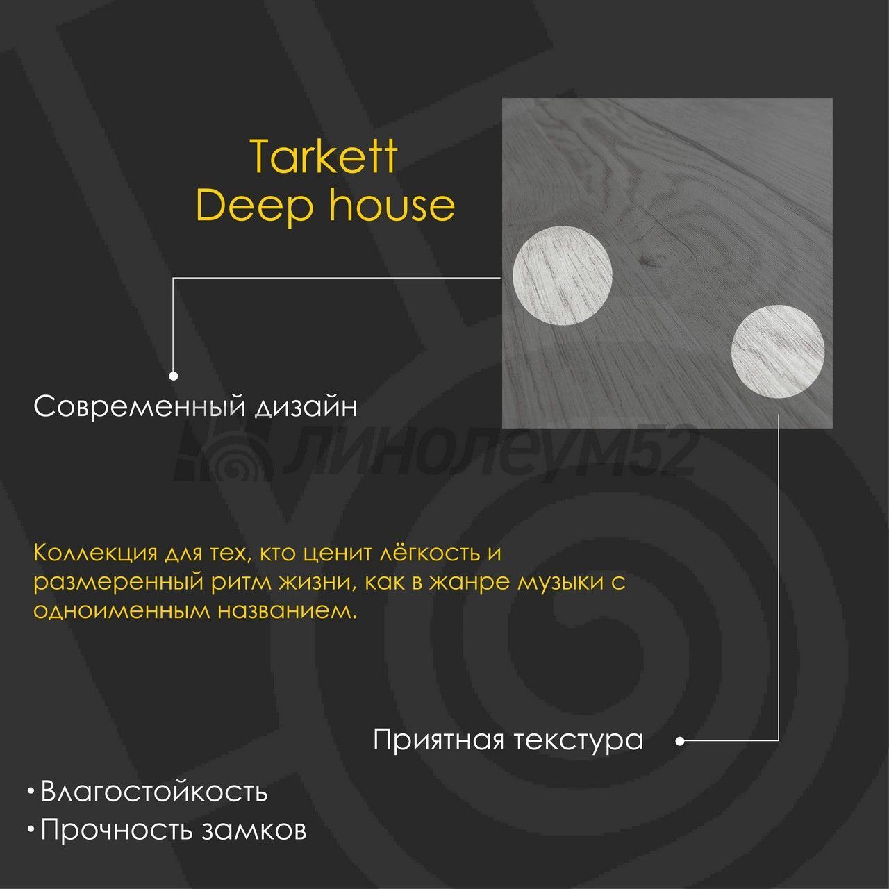 Новая коллекция "DEEP HOUSE" так же как и одноименный музыкальный жанр создает глубокую атмосферу особого стиля пространства. Шикарные планки размера "XXL" с четырехсторонней фаской визуально расширяют помещение, делая его более просторным. Покрытие подходит для жилых и общественных помещений - офисов, кафе, ресторанов и других пространств. Основание продукта "DEEP HOUSE" состоит из "SPC", каменно-полимерного композитного материала, имеющего в своем составе микромрамор и "ПВХ", что придает материалу особую прочность и долговечность. Коллекции от компании "TARKETT" расширяют границы возможного! Поликлиники и больницы - это места, где напольные покрытия подвергаются высоким нагрузкам, поэтому должны быть износостойкими. Кроме того, к ним предъявляются специальные требования - устойчивость к образованию пятен, легкость в уборке и гигиеничность. "TARKETT" также предлагает специальные покрытия с защитой от статического электричества, предназначенные для помещений, в которых установлено электронное оборудование. Универсальное покрытие для любого помещения перед вами, осталось только подобрать свой оттенок. Если у вас остались вопросы, то наши специалисты с радостью помогут найти ответы на каждый из них...