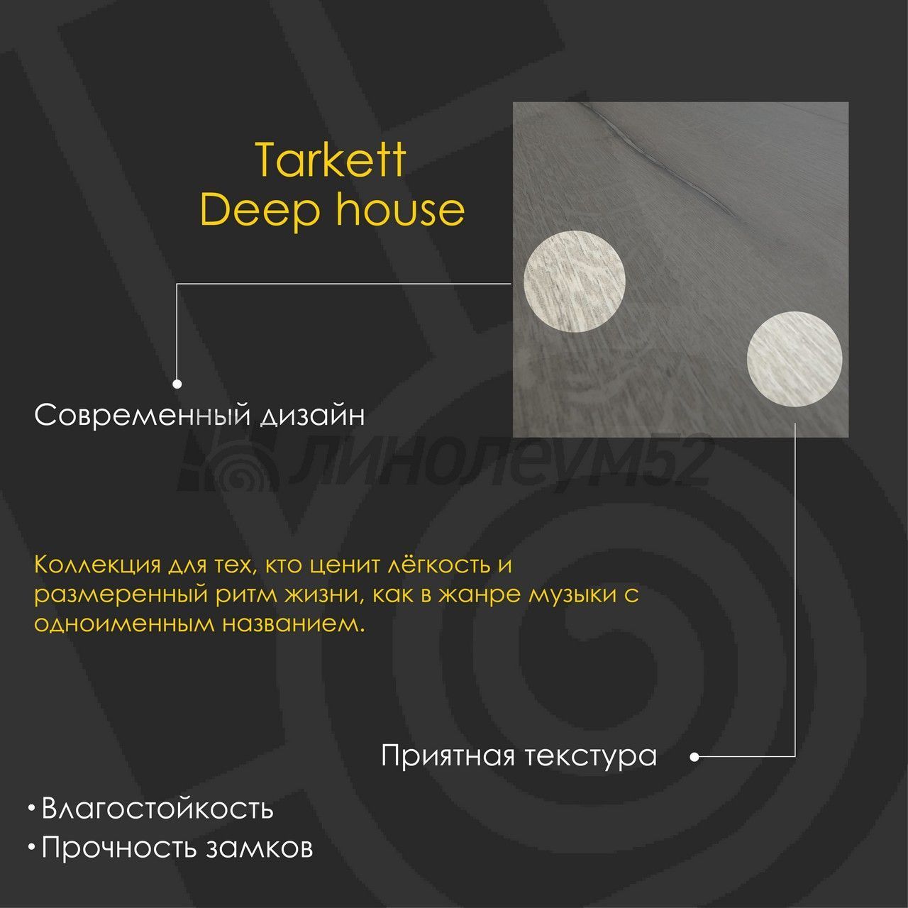 Новая коллекция "DEEP HOUSE" так же как и одноименный музыкальный жанр создает глубокую атмосферу особого стиля пространства. Шикарные планки размера "XXL" с четырехсторонней фаской визуально расширяют помещение, делая его более просторным. Покрытие подходит для жилых и общественных помещений - офисов, кафе, ресторанов и других пространств. Основание продукта "DEEP HOUSE" состоит из "SPC", каменно-полимерного композитного материала, имеющего в своем составе микромрамор и "ПВХ", что придает материалу особую прочность и долговечность. Коллекции от компании "TARKETT" расширяют границы возможного! Поликлиники и больницы - это места, где напольные покрытия подвергаются высоким нагрузкам, поэтому должны быть износостойкими. Кроме того, к ним предъявляются специальные требования - устойчивость к образованию пятен, легкость в уборке и гигиеничность. "TARKETT" также предлагает специальные покрытия с защитой от статического электричества, предназначенные для помещений, в которых установлено электронное оборудование. Универсальное покрытие для любого помещения перед вами, осталось только подобрать свой оттенок. Если у вас остались вопросы, то наши специалисты с радостью помогут найти ответы на каждый из них...