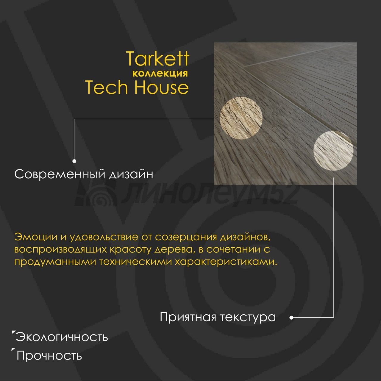 Соединение темпераментного хауса и склонного к рациональности техно дало начало новому музыкальному жанру, а также послужило вдохновением и названием для коллекции модульной SPC плитки Кварцивинил Tarkett Tech House. Tech House – это эмоции и удовольствие от созерцания дизайнов, воспроизводящих красоту дерева, в сочетании с продуманными техническими характеристиками. Влагостойкая, каменно-полимерная основа плитки Tech House дополнена усиленным транcпарентом из чистого ПВХ. Плотный слой транспарента толщиной 0.55 мм надолго защитит покрытие от истирания, а прочная, жесткая основа с добавлением измельченный горной породы – микромрамора, предотвратит деформацию и появление вмятин на поверхности. Пожарные характеристики допускают монтаж покрытия в жилых и общественных пространствах..