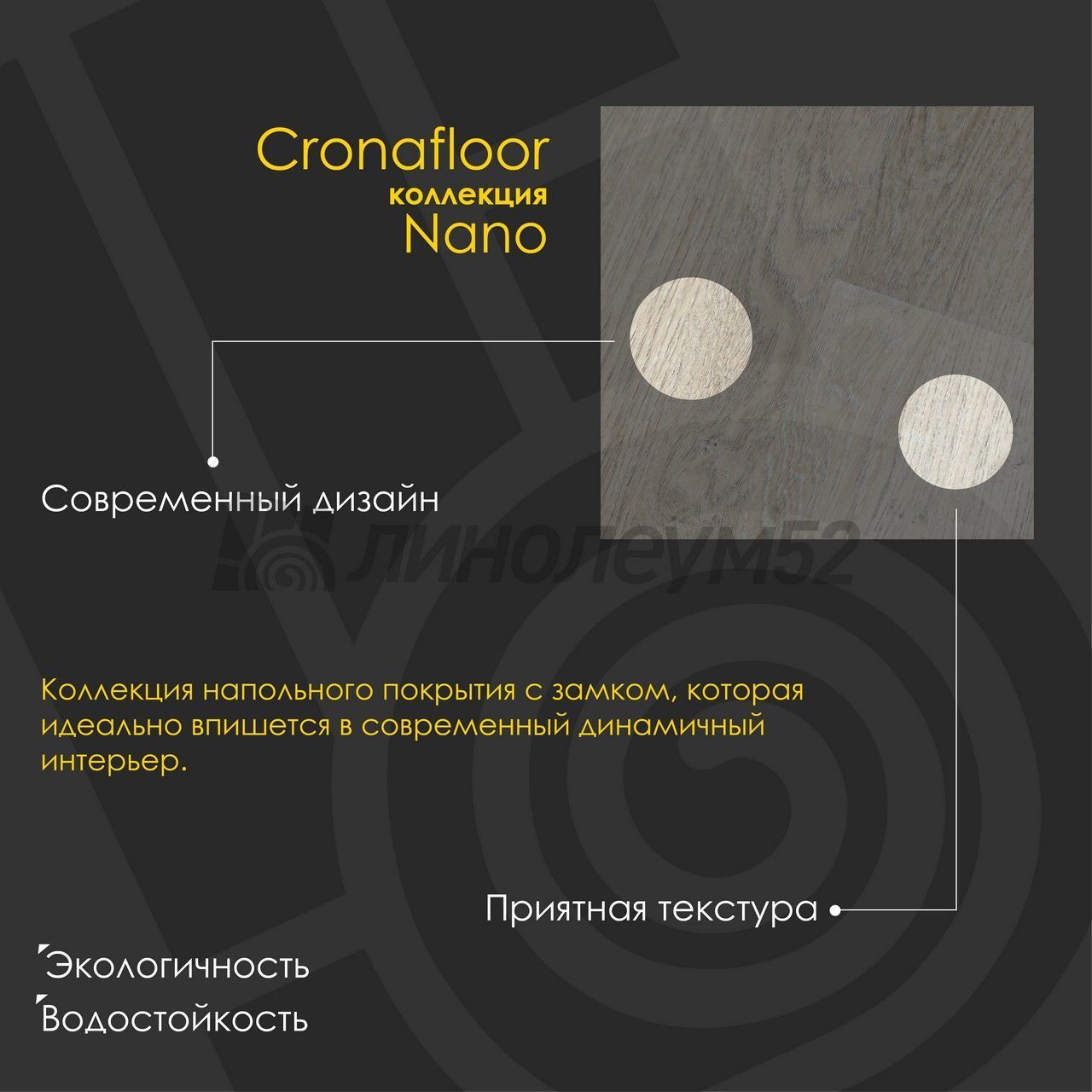 "CRONAFLOOR NANO" - это влагостойкое кварц-виниловое напольное покрытие нового поколения, сочетающее в себе красоту натурального дерева, практичность и долгий срок эксплуатации. "CRONAFLOOR NANO" относится к 42 классу износостойкости, толщиной планок - 3,5 миллиметра на замковой системе. Насыщенные оттенки в сочетании с низкой ценой выделяет данное "SPC" покрытие. Напольное покрытие нового поколения, сочетающее в себе истинную красоту натурального дерева, практичность и долгий срок эксплуатации, а довершает данные плюсы то, что это 100% экологический материал с сертификатами качества. Настоящее совершенство уже поступило в продажу. Если же у вас ещё остались вопросы, то наши специалисты с лёгкостью помогут найти ответы по каждому покрытию...
