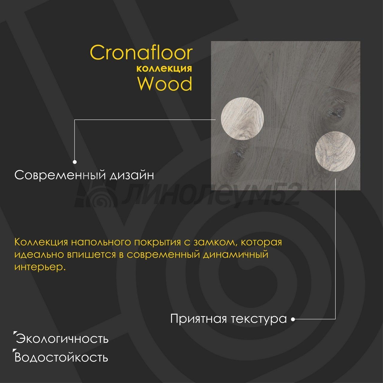 Водостойкий виниловый ламинат на минерально-полимерной основе "SPC" от бренда "CRONAFLOOR" ворвался в нашу жизнь. Классический стиль доски в сочетании с новейшими характеристиками не оставят без внимания наших покупателей. Топовые линейки из серии "WOOD" и "NANO" можно изучить на сайте "ЛИНОЛЕУМ52" или в одном из наших магазинов. Также обращаем ваше внимание, что данное покрытие обладает акустическим комфортом, а также на 100% влагостойкостью. Простота укладки и уборки, также не на последнем месте в списке преимуществ у данного покрытия. Если же у вас ещё остались вопросы, то наши специалисты с лёгкостью помогут найти ответы на каждый из них...